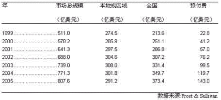 本地或區(qū)域價格方案在我們預測的時期內(nèi), 將始終是手機用戶采納的最多的一種方案。 1999年,在美國有5千7百 萬,大約70%的用戶是采用本地或區(qū)域方案, 而該方案產(chǎn)生的營業(yè)額為274.5億美元, 約占市場總規(guī)模的58.6%。Frost & Sullivan 預計,到2005年, 46.6%的手機用戶還會使用該種方案, 而該方案產(chǎn)生的營業(yè)額將為291.2億美元,占市場總規(guī)模的比例將縮至36.1%。