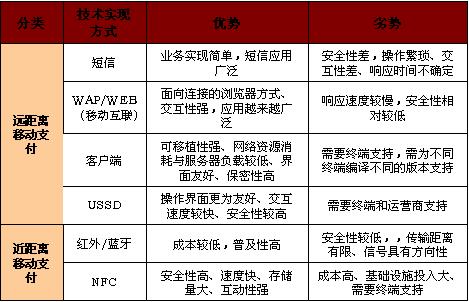 移動(dòng)支付(Mobile payment)包括遠(yuǎn)距離方式和近距離方式。遠(yuǎn)距離移動(dòng)支付的主要技術(shù)實(shí)現(xiàn)方式有SMS、WAP、客戶端(手機(jī)軟件)和USSD;近距離移動(dòng)支付的主要技術(shù)實(shí)現(xiàn)方式有紅外和NFC。各種移動(dòng)支付業(yè)務(wù)技術(shù)實(shí)現(xiàn)方式優(yōu)劣勢(shì)比較詳見圖表1。