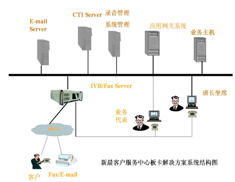 新晨客戶服務中心普及型解決方案是在以專用交換機或PC服務器加語音卡作為電話接入設備,如果用PC服務器加語音卡作為電話接入設備,將電話中繼線直接接到IVR上。此方案中的CTI系統(tǒng)能夠適用于流行的語音板卡和多種電話交換機的不同環(huán)境,這種解決方案主要針對小型的客戶服務中心推出。