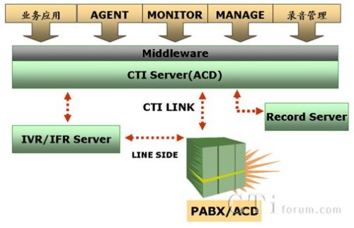 聯(lián)絡(luò)中心主要由電話呼叫分配(PBX/ACD)、計算機電話集成(CTI)、交互式語音應(yīng)答(IVR)、實時錄音和自動外撥等組成,逐漸形成了一個復(fù)雜的多系統(tǒng)異構(gòu)平臺。