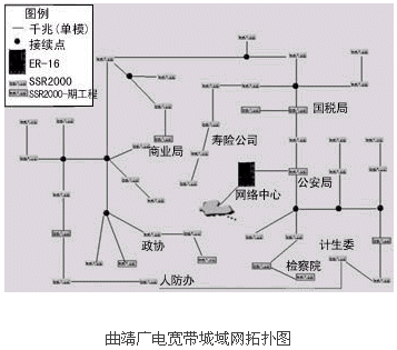 網(wǎng)絡建設的第一期工程結束后,本地多媒體寬帶骨干網(wǎng)以曲靖市政府內(nèi)的機房作為中心機房。核心機房采用支持千兆以太網(wǎng)、SDH及ATM接口的高檔交換式路由器ER-16。主干光纖沿市區(qū)鋪設成為一個星形鏈路,以便在不久的將來能夠將計生委和人防辦的光纖連接起來形成一個環(huán)狀鏈路。市區(qū)內(nèi)共設43個光節(jié)點,各鄉(xiāng)鎮(zhèn)有一個光節(jié)點,以92條單模光纖直接連入核心機房的交換式路由器,由此與核心機房形成一個星狀拓撲結構。