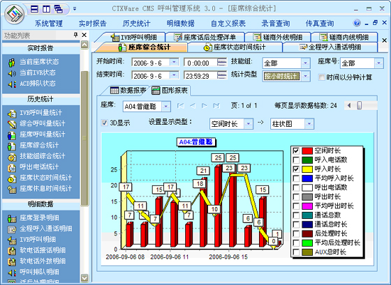 座席綜合統(tǒng)計:可以根據(jù)“月份”、“天”、“小時”來統(tǒng)計每一個座席的綜合指標(biāo)。統(tǒng)計的指標(biāo)包括:總登錄時長、空閑時長、呼入電話數(shù)、呼入時長、平均呼入時長、呼出電話數(shù)、呼出時長、平均呼出時長、通話總數(shù)、通話總時長、后處理時長、平均后處理時長、AUX總時長、電話振鈴時長、平均振鈴時長、轉(zhuǎn)移次數(shù)、磋商次數(shù)、保持次數(shù)、平均保持時長。