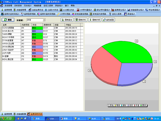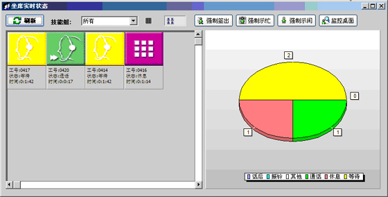 當(dāng)前座席狀態(tài):能夠提供座席的狀態(tài)表示,狀態(tài)持續(xù)時間,對應(yīng)的技能組,對應(yīng)的分機(jī)號碼,對應(yīng)的IP地址等信息?梢詫θ魏我粋座席進(jìn)行強(qiáng)制簽出、強(qiáng)制示忙、強(qiáng)制示閑操作。可以對任意座席進(jìn)行屏幕監(jiān)控操作(無需任何第三方軟件)。