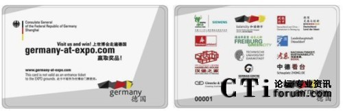 CTI論壇(ctiforum)5月17日消息(記者 潘婷婷):2010年5月,世人矚目的上海世博會已經(jīng)隆重開幕,德國館是其中的大熱門之一。想一睹德國館的風(fēng)采,一般都需要排2~3個小時的長隊。而觀眾可能不知道除了德國國家館外,德國還有多個城市在浦西的城市最佳實踐區(qū)展出。為了讓觀眾更好、更全面地體驗德國參展的所有活動,德國駐上?傤I(lǐng)事館聯(lián)手智能卡領(lǐng)域的專家捷德公司共同推出了德國館智能參觀卡,觀眾只需持卡參觀德國的其他相關(guān)展區(qū)后,就可以不用排隊進入德國國家館了。