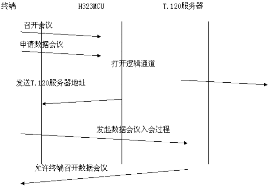 采用帶外方式,數(shù)據(jù)與音頻視頻流分開(kāi),各自占用帶寬。與終端和MCU無(wú)任何關(guān)系。如果用戶(hù)想召開(kāi)數(shù)據(jù)會(huì)議,需要單獨(dú)的一臺(tái)PC機(jī)來(lái)進(jìn)行數(shù)據(jù)的接受與傳送,所有需要數(shù)據(jù)會(huì)議功能的用戶(hù)的PC機(jī)都連接到一個(gè)T.120服務(wù)器上。目前常用的終端軟件是Netmeeting軟件。數(shù)據(jù)占用單獨(dú)的帶寬,不擠占音視頻的帶寬。會(huì)議建立過(guò)程為: