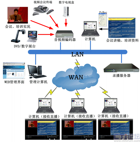 如上圖所示,會易錄采用前后臺分離模式,前臺設(shè)備(視音頻編碼器、數(shù)據(jù)編碼器)負責信號采集;后臺設(shè)備(多媒體錄播服務(wù)器)負責信號處理。前后臺設(shè)備之間通過IP網(wǎng)絡(luò)進行通訊。上述編碼器可將采集到的視音頻信號和計算機屏幕信號編碼后通過網(wǎng)絡(luò)發(fā)送到后臺的多媒體錄播服務(wù)器,多媒體錄播服務(wù)器可將收到的視音頻信號和計算機屏幕信號進行同步一體化的錄制、直播、點播。