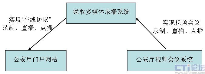 銳取多媒體錄播系統(tǒng)采用了分布式的架構(gòu),前端的視音頻編碼器負(fù)責(zé)視音頻信號(hào)的采集,后臺(tái)的多媒體錄播服務(wù)器負(fù)責(zé)信號(hào)的錄制、直播和點(diǎn)播。前端的視音頻編碼器可從視頻會(huì)議系統(tǒng)中獲取信號(hào),這樣“在線訪談”的公安機(jī)關(guān)領(lǐng)導(dǎo)或?qū)<铱梢栽谝曨l會(huì)議中的任何一個(gè)會(huì)場與廣大網(wǎng)民在線交流。