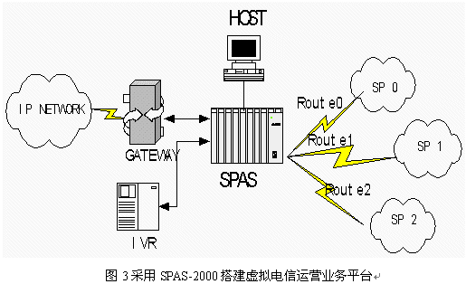中國(guó)加入WTO后,國(guó)內(nèi)與國(guó)際的聯(lián)系、交流和溝通將會(huì)越來(lái)越頻繁,這一趨勢(shì)帶來(lái)了巨大的電信服務(wù)市場(chǎng)商機(jī)。同時(shí),國(guó)際電信企業(yè)正在尋求進(jìn)入中國(guó)的途徑,國(guó)內(nèi)新興的電信運(yùn)營(yíng)商積極應(yīng)對(duì)這種局面,而虛擬電信運(yùn)營(yíng)商也在國(guó)內(nèi)開(kāi)始出現(xiàn)。如何爭(zhēng)取客戶是所有這些提供電信服務(wù)的企業(yè)共同面臨的課題。一個(gè)智能化的、高效的、靈活的、有特點(diǎn)并易于控制的服務(wù)平臺(tái)無(wú)疑是他們進(jìn)行競(jìng)爭(zhēng)的重要工具。由于SPAS-2000可編程交換機(jī)是一個(gè)全開(kāi)放的靈活平臺(tái),用戶通過(guò)應(yīng)用程序幾乎可以完全控制交換,能很好的滿足用戶的需求。在此SPAS-2000可編程交換機(jī)上開(kāi)發(fā)的電話批發(fā)及零售業(yè)務(wù)應(yīng)用,配合計(jì)算機(jī)技術(shù),能靈活控制業(yè)務(wù)的路由選擇、費(fèi)率計(jì)算并可提供個(gè)性化服務(wù),為運(yùn)營(yíng)商降低運(yùn)營(yíng)成本,提高服務(wù)質(zhì)量給出了有效的解決方案。例如一個(gè)IP電話運(yùn)營(yíng)商在全球互連中可能有多個(gè)合作伙伴,每個(gè)合作伙伴提供的服務(wù)也不相同,為了節(jié)省費(fèi)用并提高服務(wù)質(zhì)量,IP電話運(yùn)營(yíng)商需要根據(jù)時(shí)段、費(fèi)率、通話質(zhì)量、接通率等指標(biāo)智能選擇去話路徑。SPAS-2000可編程交換機(jī)提供編程開(kāi)發(fā)接口,通過(guò)E1與IVR連接,在服務(wù)器上開(kāi)發(fā)高層應(yīng)用軟件,可以實(shí)現(xiàn)多種高級(jí)功能。同時(shí)SPAS還可以連接各種型號(hào)的網(wǎng)關(guān)。應(yīng)用連接圖見(jiàn)圖3: