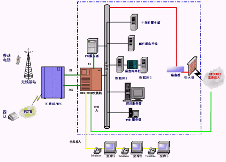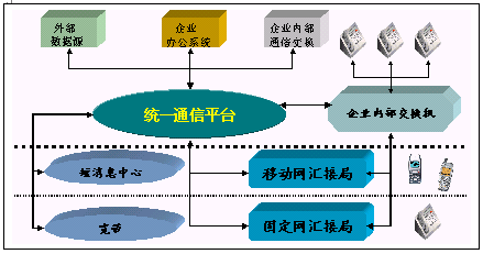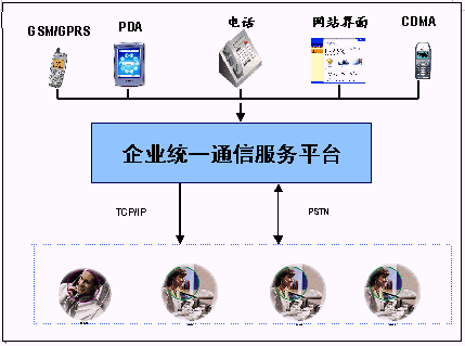 統(tǒng)一通信平臺提供了與企業(yè)內部交換機(PBX)或PSTN,寬帶或INTERNET和GSM或GPRS網(wǎng)絡的接口,融合了多種網(wǎng)絡資源和企業(yè)內部數(shù)據(jù)源。為用戶提供了多種服務界面:WEB界面、人工服務界面,IVR界面。同時為用戶提供短信息等數(shù)據(jù)業(yè)務。