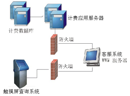 。。觸摸屏查詢系統(tǒng)通過WWW方式訪問鐵通客服系統(tǒng)的WEB服務器,再由WEB服務器訪問計費系統(tǒng)的應用服務器,由應用服務器上的代理訪問計費系統(tǒng)的數(shù)據(jù)庫。由于觸摸屏查詢系統(tǒng)與客服系統(tǒng)WEB服務器之間、客服系統(tǒng)WEB服務器與計費應用服務器每層都有網(wǎng)絡防火墻進行隔離,同時客服系統(tǒng)的WEB服務器并不直接訪問計費數(shù)據(jù)庫,因此可以保證計費系統(tǒng)的數(shù)據(jù)安全。在觸摸屏上用戶除了訪問系統(tǒng)提供的功能以外,不能做任何操作,再次保證了系統(tǒng)的安全可靠。