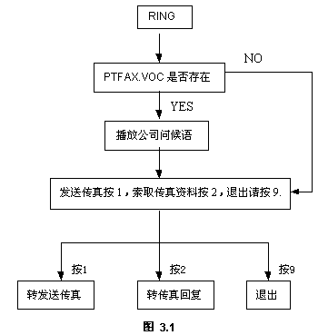 其中PTFAX.VOC存在當(dāng)前工作路徑,如果存在,則播放公司問(wèn)候語(yǔ),接著播放下一句語(yǔ)音提示;如果該文件不存在,則系統(tǒng)直接播放VFGT.VOC的內(nèi)容,用戶可根據(jù)實(shí)際需求而定。