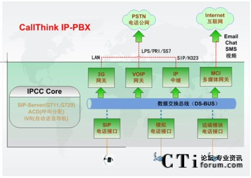 IPCC Core是IP-PBX的核心部分,提供了配置IP分機(jī)號碼(Extension Number)、功能按鈕以及通話管理和ACD路由策略功能;它可以支持多達(dá)1000個IP語音終端呼叫請求,通過分組交換,實(shí)現(xiàn)IP分機(jī)、普通分機(jī)、互聯(lián)網(wǎng)上IP電話之間的互聯(lián)互通;通過Voip網(wǎng)關(guān),可以實(shí)現(xiàn)IP網(wǎng)絡(luò)和傳統(tǒng)電路交換電話網(wǎng)的通信,完成異種網(wǎng)絡(luò)的電話呼入和呼出;