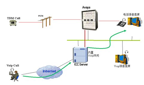 通過傳統(tǒng)電話網(wǎng)絡(luò)來(lái)的呼叫通過交換機(jī)呼叫ICC服務(wù)器內(nèi)置的Voip網(wǎng)關(guān),Voip網(wǎng)關(guān)將呼叫轉(zhuǎn)換為Voip呼叫,轉(zhuǎn)接到座席;