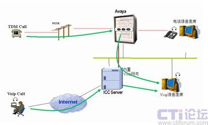 通過(guò)Internet來(lái)的Voip呼叫通過(guò)ICC服務(wù)器的內(nèi)置Voip網(wǎng)關(guān)轉(zhuǎn)換為電路形式的電話,呼叫交換機(jī),分配到座席。