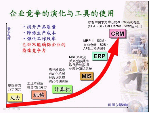 如此龐大的系統(tǒng)以信息技術(shù)角度來(lái)看,確實(shí)已經(jīng)涵蓋了企業(yè)日常營(yíng)運(yùn)作業(yè)的6、7成以上,因此,很多企業(yè)的主管甚或MIS主管認(rèn)為建置了ERP系統(tǒng)之后其實(shí)就已經(jīng)作好企業(yè)e化的工作了,其實(shí)仔細(xì)思考之后您會(huì)發(fā)覺ERP系統(tǒng)還是有其功能限制之處,以業(yè)務(wù)單位之銷售工作推展為例,所能享受到的e化成果真是少之又少,許多業(yè)務(wù)人員平日最常運(yùn)用到ERP系統(tǒng)大都為訂單管理部份,只有少部份的業(yè)務(wù)人員同時(shí)會(huì)運(yùn)用到ERP系統(tǒng)中之報(bào)價(jià)功能,尤其ERP系統(tǒng)對(duì)業(yè)務(wù)人員在開發(fā)潛在客戶或作好案例管理方面之應(yīng)用更是幫助有限。