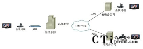 該套視頻會議系統(tǒng)最大的特點就是擁有超強的網(wǎng)絡適應性。由于采用了高效視音頻編碼技術(shù)和大量智能化網(wǎng)絡適應技術(shù),無論是ADSL、光纖還是VPN,均可進行快速接入,并充分保證在Internet環(huán)境下的會議效果。因此,天元置業(yè)此次視頻會議系統(tǒng)就是完全基于公司現(xiàn)有的Internet進行部署的。如圖1。