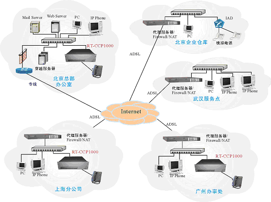 。。在北京、上海和廣州分別架設(shè)一個(gè)RT-CCP1000,利用其IP中繼通過Internet進(jìn)行組網(wǎng),建立一個(gè)統(tǒng)一通信系統(tǒng),武漢服務(wù)點(diǎn)直接部署IP電話終端作為內(nèi)部分機(jī),北京的企業(yè)倉(cāng)庫(kù)由于人數(shù)較多,且計(jì)算機(jī)應(yīng)用層次不高,可以使用IAD部署模擬話機(jī)作為內(nèi)部分機(jī)。北京總部辦公室通過路由器用專線方式接入Internet,有固定的公網(wǎng)IP地址,上海、廣州、武漢和北京的企業(yè)倉(cāng)庫(kù)都是采用ADSL方式接入Internet,無(wú)固定的公網(wǎng)IP,每個(gè)分支點(diǎn)的企業(yè)內(nèi)網(wǎng)通過防火墻/NAT連接Internet。