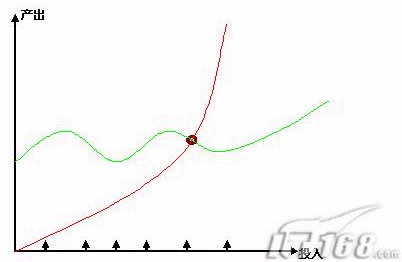 我們可以看到,投入和產(chǎn)出是按月增長的,那么億美目前呢,是(綠線)慢慢增長的一個曲線,隨著投入增加,持續(xù)是一個規(guī)模性的增長。這類似一個2003-2005年,持續(xù)是這樣一個營銷型的穩(wěn)步增長。那么,從2006年開始,這個地方(棕色)的出現(xiàn),開始出現(xiàn)新的變化和新的增長方式,那么我們說這個點(diǎn)叫做拐點(diǎn)。那么傾斜角度和產(chǎn)出就發(fā)生了變化了。那么比如今后發(fā)展到一個階段,新的平臺,新的內(nèi)容出來后,那么這個拐點(diǎn)也同樣會發(fā)生變化。