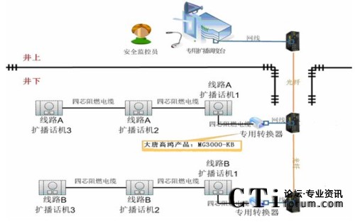 系統(tǒng)采用全分布式控制結構。主要由專用防爆轉換器(MG3000-KB)、防爆擴播電話機、隔爆兼本安型電源和專用擴播調(diào)度臺構成。專用擴播調(diào)度臺位于地面中央控制室,專用擴播調(diào)度臺與專用轉換器之間采用工業(yè)以太網(wǎng)絡連接,專用防爆轉換器與防爆擴播電話機之間采用總線結構聯(lián)接。