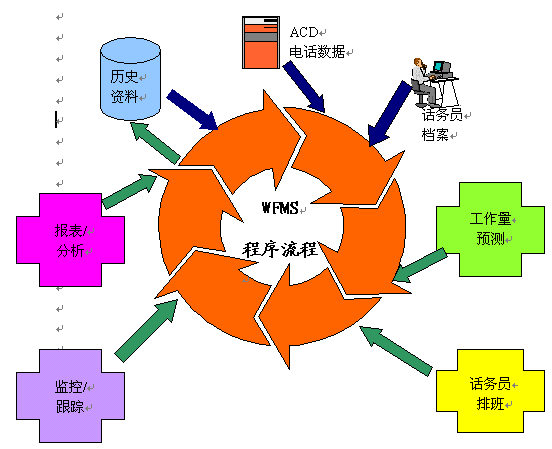 如上面所描述的WFMS流程,最初開(kāi)始于歷史的電話信息、目前的ACD數(shù)據(jù)和服務(wù)代表的簡(jiǎn)介。從這些綜合的信息,做出對(duì)工作量的預(yù)測(cè),從而從本質(zhì)上決定了配備給呼叫中心的服務(wù)代表數(shù)量。了解了服務(wù)代表的需求數(shù)量,一個(gè)適用于任何時(shí)間段的工作時(shí)間表就可以產(chǎn)生了,包括每天的,每周的,每月的;谶@一點(diǎn),主管人就可以監(jiān)控服務(wù)代表的行為,追蹤來(lái)電,并分析不同種類(lèi)的來(lái)電分組,做出應(yīng)對(duì)假定情景的方案,從而產(chǎn)生各種各樣的報(bào)告和圖表。