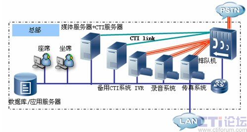 北京為總部中心,將部署CTI服務(wù)器、IVR服務(wù)器、錄音系統(tǒng)、傳真系統(tǒng)、文件服務(wù)器及相關(guān)業(yè)務(wù)數(shù)據(jù)庫服務(wù)器,為各個營業(yè)網(wǎng)點提供業(yè)務(wù)支撐。總部將對整個網(wǎng)絡(luò)進行管理,包括平臺配置、業(yè)務(wù)管理、數(shù)據(jù)管理、人員調(diào)度等。在總部CTI系統(tǒng)我們采用主備模式,確保了在出現(xiàn)網(wǎng)絡(luò)故障主CTI系統(tǒng)無法提供服務(wù)情況下,備用CTI系統(tǒng)將接替主CTI系統(tǒng)工作,確保了整個系統(tǒng)的正常工作。硬件平臺方面,UAP我們采用了雙主控板雙電源供電工作模式,這對系統(tǒng)長期穩(wěn)定工作提供了保障?偛客瑫r也部署北京農(nóng)村商業(yè)銀行300個坐席人員,這些坐席人員可以按照業(yè)務(wù)進行區(qū)分,大部分坐席精通一般的業(yè)務(wù),為普通客戶提供優(yōu)質(zhì)服務(wù),少部分坐席(專業(yè)坐席)人員為高價值客戶提供高級的專業(yè)的優(yōu)質(zhì)服務(wù),在普通坐席比較忙時,專業(yè)坐席可以為普通用戶提供服務(wù),坐席中,還有極少部分可以充當坐席管理員角色,他們也可以監(jiān)控各個分中心坐席服務(wù)的質(zhì)量,對有問題服務(wù)可以實現(xiàn)監(jiān)聽、監(jiān)察、和強拆功能,及時的保證服務(wù)質(zhì)量,維護了企業(yè)形象。