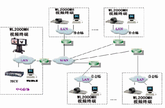 分會場配置WL-2000MH會議終端,具有快速以太網(wǎng)LAN接口,在H.323上可達到4M。實際應用中,分會場工作速率在512K-2M自適應可調。中心會場可通過局域網(wǎng)對分會場設備遠程管理。終端通過RS232口連接攝像機,中心會場可進行遙控分會場的攝像機,注本地也可以進行攝像機控制。WL-2000MH會議終端有兩路視頻輸出,一路為遠端視頻,一路為本地視頻,分會場可選擇兩個顯示設備如大屏幕彩電或背投電視。