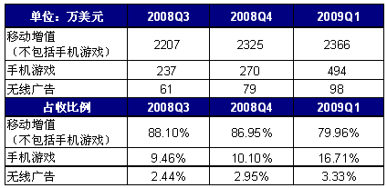 2009年第1季度,空中網(wǎng)手機(jī)游戲服務(wù)營(yíng)收為494萬(wàn)美元,同比增長(zhǎng)304%,環(huán)比增長(zhǎng)83%;其中手機(jī)網(wǎng)游的營(yíng)收為72萬(wàn)美元,同比增長(zhǎng)379%,環(huán)比增長(zhǎng)11%,單機(jī)游戲和WAP頁(yè)面游戲的服務(wù)營(yíng)收為422萬(wàn)美元,同比增長(zhǎng)293%,環(huán)比增長(zhǎng)106%。手機(jī)游戲業(yè)務(wù)在空中網(wǎng)銷售收入中所占比重由2008年第4季度的10.10%上漲至16.71%。