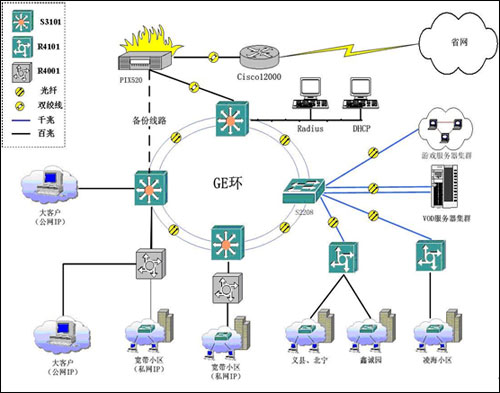 此城域網(wǎng)結(jié)構(gòu)清晰,由核心層的三層交換機只負責數(shù)據(jù)的快速轉(zhuǎn)發(fā),對業(yè)務(wù)匯聚和用戶的認證控制任務(wù)全部由接入服務(wù)器R4000來完成。要求接入服務(wù)器支持多種認證手段、加強對各類用戶實現(xiàn)不同級別的控制、為用戶的訪問提供安全保障措施、結(jié)合Radius系統(tǒng)提供多種計費功能。