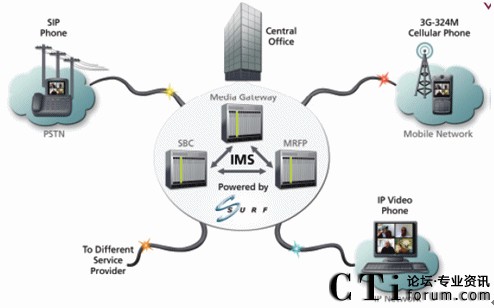 下圖顯示了 Surf 的統(tǒng)一通信平臺如何融合PSTN、 3G(3.5G)移動網(wǎng) 和 IP 這三種網(wǎng)絡(luò)。