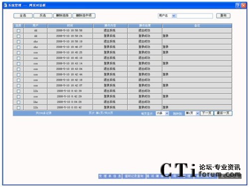 查詢:可以根據(jù)用戶名、時間、操作和操作結果為條件進行查詢,先選擇要查詢的字段,然后輸入查詢條件,點擊“查詢”按鈕查詢需要的結果。