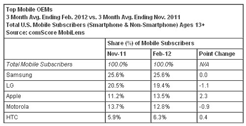 按截至今年2月份的三個(gè)月的平均數(shù)計(jì)算,美國(guó)13歲以上的手機(jī)用戶(hù)數(shù)為2.34億。三星名列手機(jī)原始設(shè)備制造商之首,占有美國(guó)手機(jī)市場(chǎng)25.6%的份額;LG電子名列第二,占有19.4%的市場(chǎng)份額;蘋(píng)果排名第三,占有13.5%的市場(chǎng)份額(上升2.3個(gè)百分點(diǎn));摩托羅拉排名第四,占有12.8的市場(chǎng)份額;HTC排名上升至第五,占有6.3%的市場(chǎng)份額(上升0.4個(gè)百分點(diǎn))。
