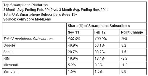 按截至今年2月份的三個(gè)月的平均數(shù)計(jì)算,美國(guó)智能手機(jī)用戶(hù)數(shù)超過(guò)1.04億人,相比截止去年11月的三個(gè)月的平均數(shù)增長(zhǎng)14%。谷歌Android操作系統(tǒng)在美國(guó)手機(jī)市場(chǎng)的份額超過(guò)50%,相比去年同期上升了17個(gè)百分點(diǎn);蘋(píng)果iOS操作系統(tǒng)排名第二,其市場(chǎng)份額為30.2%(與去年同期相比上升了5個(gè)百分點(diǎn));其后依次是RIM黑莓操作系統(tǒng)的13.4%,微軟Windows