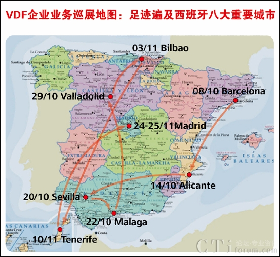 Vodafone 09企業(yè)業(yè)務(wù)巡展是Vodafone攜手10家重要合作伙伴和28家SP針對(duì)西班牙企業(yè)用戶舉行的一個(gè)大型巡展,整個(gè)展會(huì)歷時(shí)兩個(gè)月,以西班牙的經(jīng)濟(jì)文化中心Barcelona為起點(diǎn),途徑Alicante、Sevilla、Malaga、Valladolid、Bilbao、Tenerife,最后于11月24-25號(hào)在西班牙首府Madrid隆重謝幕。共有1萬(wàn)多人、五千多家企業(yè)參加了本次展會(huì),受邀企業(yè)覆蓋到金融、貿(mào)易、電信、交通、建筑、服務(wù)、醫(yī)療保健等重要行業(yè),其中大都為移動(dòng)辦公需求旺盛需要保持實(shí)時(shí)協(xié)同的中小型企業(yè)。展會(huì)期間,華為歐洲地區(qū)部多位高層領(lǐng)導(dǎo)親臨展會(huì)現(xiàn)場(chǎng)指導(dǎo)工作,包括Vodafone系統(tǒng)部副總Edward Chan和張文林、代表處代表謝新平、歐洲軟件業(yè)務(wù)部領(lǐng)導(dǎo)林劼。領(lǐng)導(dǎo)們和客戶親切交流,并廣泛了解了其他SP展出的多項(xiàng)創(chuàng)新業(yè)務(wù)。