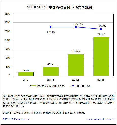 艾瑞咨詢(xún)數(shù)據(jù)顯示,截至2011年底,中國(guó)移動(dòng)支付交易規(guī)?傤~將達(dá)到481.4億元,同比增長(zhǎng)149.4%,整體呈現(xiàn)爆發(fā)式的增長(zhǎng)態(tài)勢(shì)。艾瑞預(yù)計(jì),中國(guó)移動(dòng)支付交易規(guī)模將在2013年底超過(guò)2000億元。
