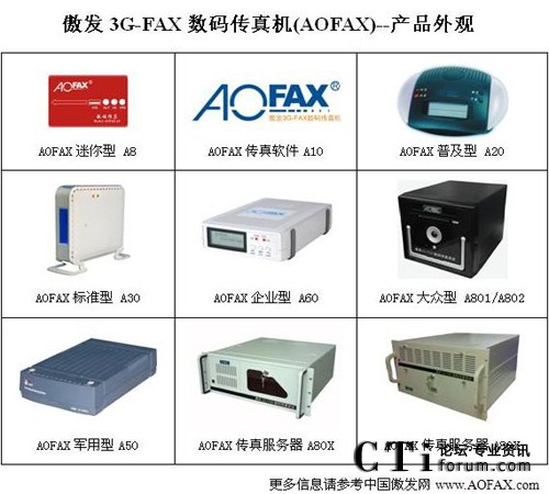 AOFAX系列電腦傳真產(chǎn)品擁有最齊全的型號,包括免費(fèi)使用的AOFAX傳真軟件A10、SOHO/商旅人士便攜使用的AOFAX迷你型數(shù)碼傳真機(jī)A8、單電腦使用的AOFAX普及型數(shù)碼傳真機(jī)A20、4用戶環(huán)境的AOFAX標(biāo)準(zhǔn)型電子傳真機(jī)A30、軍警使用的AOFAX軍用型傳真系統(tǒng)A50、公安專用傳真服務(wù)器A51、營運(yùn)版網(wǎng)絡(luò)傳真服務(wù)期A52、不限用戶數(shù)目的AOFAX企業(yè)型網(wǎng)絡(luò)傳真機(jī)A60、1至2線的AOFAX大眾型傳真服務(wù)器A801和A802,2至256傳真線路多種規(guī)格的AOFAX專業(yè)型傳真服務(wù)器A80X、跨區(qū)域大型公司使用的集團(tuán)傳真系統(tǒng)和行業(yè)解決方案等,價格從幾百到幾十萬元,可適應(yīng)各類型客戶的需求,以下為AOFAX全系列產(chǎn)品外觀圖。