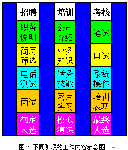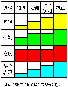 即使經(jīng)過(guò)規(guī)范的上崗培訓(xùn)與考核,新員工通常也只達(dá)到老員工70%左右的表現(xiàn)。因此制定明確的實(shí)習(xí)期,在實(shí)習(xí)期間加強(qiáng)指導(dǎo)和培養(yǎng)是非常重要的。通常經(jīng)過(guò)3個(gè)月的實(shí)習(xí),新員工已經(jīng)可以達(dá)到一個(gè)標(biāo)準(zhǔn),這時(shí)便可以轉(zhuǎn)正了。圖3和圖4表現(xiàn)了不同階段對(duì)CSR的不同預(yù)期,以及不同階段的主要工作。