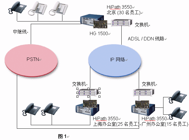 西門子推薦該公司每一個(gè)辦公室均采用HiPath 3550 PBX。如果,A公司每個(gè)辦公室已經(jīng)擁有DDN專線或ADSL連接至Internet,它就能將其內(nèi)部通信建設(shè)在現(xiàn)存的IP網(wǎng)絡(luò)的基礎(chǔ)之上。其集成網(wǎng)關(guān)HiPath 1500被用來連接數(shù)據(jù)網(wǎng)絡(luò)和語音網(wǎng)絡(luò)。在這樣的網(wǎng)絡(luò)架構(gòu)中,路由冗余能夠得到充足的保證,因?yàn)槲鏖T子HiPath解決方案提供了最大的網(wǎng)絡(luò)存活性:即使IP網(wǎng)絡(luò)出現(xiàn)故障,西門子網(wǎng)絡(luò)設(shè)置能夠?qū)⒙酚勺詣?dòng)切換至PSTN之上。