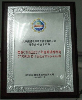 CTI論壇(ctiforum)1月4日消息(記者 張潔): 近日,由CTI論壇主辦的2011年度“編輯推薦獎(jiǎng)”評(píng)選結(jié)果正式揭曉,捷通華聲語(yǔ)音合成技術(shù)產(chǎn)品榮獲CTI論壇2011年度編輯推薦獎(jiǎng)。