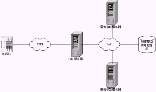 這種模式是最常見的一種接入情況。將原有煩瑣的按鍵式提示改成更具人性化的交談式語音交互,類似于語音門戶模式。這是目前大家普遍認同的一種語音識別技術(shù)應用方式。相比原有的按鍵方式,系統(tǒng)的新穎程度、個性化程度、用戶操作的方便程度等都得到了極大的提高,如語音識別技術(shù)在股票查詢中的成功應用,在點歌系統(tǒng)中的成功應用等;另外利用語音識別技術(shù)也解決了一些原有系統(tǒng)無法實現(xiàn)的技術(shù)難題,如火車時刻查詢、機場航班查詢等,原有系統(tǒng)借助郵政編碼、電話區(qū)號等的方式讓人無所適從,現(xiàn)在直接和系統(tǒng)交談,順利獲取所需信息,可以說是語音識別技術(shù)一個成功的應用。這種系統(tǒng)的拓撲結(jié)構(gòu)如下圖示: