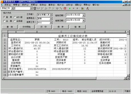 指定坐席的工作狀態(tài)(坐席工號、分機號碼、業(yè)務(wù)類型、忙閑狀態(tài)、通話時長等)
