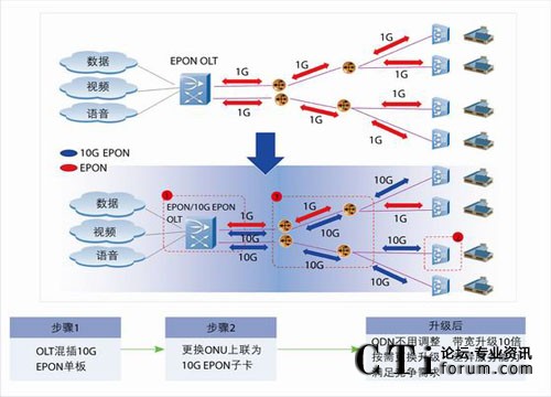 項(xiàng)目選取的試點(diǎn)小區(qū)建設(shè)于2006年,原來(lái)規(guī)劃的是每用戶6M帶寬。后期小區(qū)實(shí)裝率高,實(shí)際用戶超過(guò)1500戶,IPTV業(yè)務(wù)申請(qǐng)量提升后,出現(xiàn)了高峰時(shí)段IPTV點(diǎn)播業(yè)務(wù)不流暢、同時(shí)應(yīng)用IPTV和上網(wǎng)業(yè)務(wù)時(shí)網(wǎng)速過(guò)慢等問(wèn)題。而且當(dāng)湖北電信新推出10M~20M的新寬帶套餐時(shí),該小區(qū)用戶申請(qǐng)新套餐數(shù)量受限。該小區(qū)的寬帶接入網(wǎng)絡(luò)已經(jīng)明顯無(wú)法滿足用戶日益增長(zhǎng)的需求,寬帶提速正當(dāng)其時(shí)。選擇10G EPON,能夠簡(jiǎn)單兩步,將小區(qū)接入方式從EPON平滑升級(jí)為10G EPON,無(wú)需改變網(wǎng)絡(luò)結(jié)構(gòu),只需簡(jiǎn)單升級(jí)設(shè)備(見圖)。
