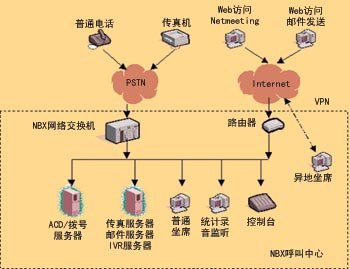 NBX網(wǎng)絡(luò)呼叫中心的核心是3Com公司的NBX網(wǎng)絡(luò)電話交換機(jī),它具有PBX的功能,支持多種外線接入方式,呼入的語(yǔ)音信號(hào)轉(zhuǎn)換為數(shù)據(jù)包,在局域網(wǎng)內(nèi)部傳輸,實(shí)現(xiàn)局域網(wǎng)內(nèi)部語(yǔ)音、數(shù)據(jù)的統(tǒng)一。坐席可以延伸到數(shù)據(jù)網(wǎng)可以達(dá)到的地方(適當(dāng)?shù)膸挘皇艿乩砦恢玫南拗。你可以通過(guò)申請(qǐng)各類(lèi)專線,如VPN、DDN等,將計(jì)算機(jī)連入呼叫中心,實(shí)現(xiàn)分地域、分種類(lèi)、分?jǐn)?shù)據(jù)的服務(wù)。NBX網(wǎng)絡(luò)呼叫中心擴(kuò)大了對(duì)外服務(wù)方式,通過(guò)上網(wǎng)訪問(wèn)企業(yè)主頁(yè),并使用Windows集成的Netmeeting軟件通過(guò)使用電腦的聲卡、耳機(jī)、麥克風(fēng)直接與服務(wù)代理人員進(jìn)行語(yǔ)音交流。