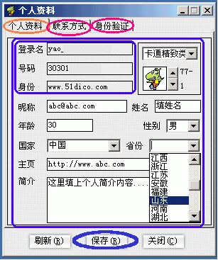 、冱c按"個人資料"命令(圖3的B1處),彈出"個人資料"修改窗口,包括"個人資料/聯(lián)系方式/身份驗證"這三大類選項卡。其中:"個人資料"選項卡下,除登錄名、號碼和身份這三項不可更改外,其余各項都是可填或可選項,據(jù)你所需進(jìn)行修改就是了(下圖4)。另外,還有"聯(lián)系方式"和"身份驗證"兩大選項,怎么個用法自己點開一看就明白了你!