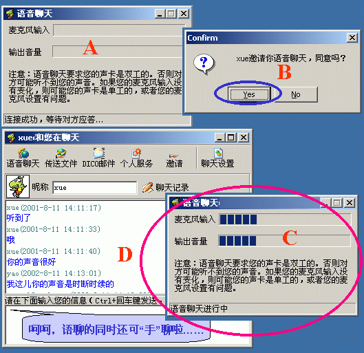 在好友窗口內(nèi)單擊某"在線好友頭像"后選"語音聊天"命令(或在即時聊天窗口中點按"語音聊天"按鈕)后,主動方彈出"正等待對方應(yīng)答窗口提示";而被叫方會彈出"應(yīng)答與否的窗口","YES"后雙方即可聊了(下圖9)。而且,它不受防火墻的限制(下圖就是我與一個在防火墻后的朋友的聊天界面)。在這一點上,QQ就望塵莫及了!