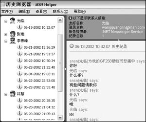 MSN Helper啟動(dòng)時(shí)會(huì)自動(dòng)啟動(dòng)MSN,可以看到在MSN的菜單欄上多了一個(gè)“助手”菜單。在這里“打開(kāi)歷史瀏覽器”,就可以輕松地查看聊天記錄啦(如圖1)。如果覺(jué)得某些聊天的內(nèi)容比較重要,在右邊的記錄窗口里拖選中這些記錄,然后單擊“文件”菜單,將聊天記錄保存或打印出來(lái)。