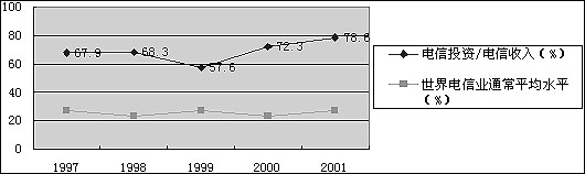 由于電信收入無法實現(xiàn)高增長,我國電信運營商如果繼續(xù)連續(xù)進行大規(guī)模投資,將無法收回投資。我國電信運營業(yè)的投資一直保持在高水平,2000年度我國電信投資占到電信收入的72.3 %,而世界平均水平為21.9 %。在2001年度,我國電信投資/電信收入的比例高達78.6 %(依據(jù)CCID數(shù)據(jù)),這樣高的投資比例是不可能維持的。