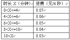 例3,國內(nèi)長(zhǎng)途話費(fèi)在時(shí)長(zhǎng)不超過4分鐘的情況下,按0.07元/6秒收;超過4分鐘但不超過6分鐘,統(tǒng)一按0.06元/6秒收取;超過6分鐘但不超過8分鐘,統(tǒng)一按0.05元/6秒收;超過8分鐘但不超過10分鐘,統(tǒng)一按0.04元/6秒收。怀^10分鐘,統(tǒng)一按0.03元/6秒收取。