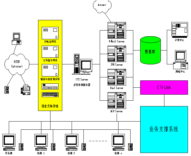 所述的電子郵件服務器(7)、交互式語音管理服務器(8)、撥號服務器(9)以及用于平均分配話務的語音系統(tǒng)分配服務器(10)均位于所述系統(tǒng)管理服務器(6)與數(shù)據(jù)庫(12)之間。所述的四個服務器(7~10)通過一個CTI業(yè)務接口(15)與業(yè)務支撐系統(tǒng)(16)連接。