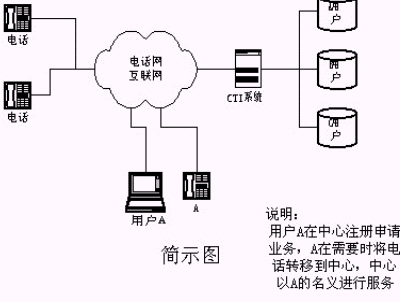 該業(yè)務方法涉及一種用戶電話轉(zhuǎn)移到CTI(Computer Telephony Integration)語音服務系統(tǒng)的接續(xù)服務方法,其CTI系統(tǒng)通過接口連接于公用電話網(wǎng),用戶在CTI系統(tǒng)登記,選擇服務功能,相關(guān)信息存入數(shù)據(jù)庫,用戶電話設置轉(zhuǎn)移;當客戶呼叫已轉(zhuǎn)移用戶電話時,自動接入CTI語音系統(tǒng),請求相關(guān)信息,對信息進行分析判斷、處理,查詢數(shù)據(jù)庫用戶信息,以用戶名義進行接續(xù)服務。其完全避免了傳統(tǒng)CTI系統(tǒng)的專用特服號碼服務的弊端,充分利用了交換機的功能,以用戶的電話號碼為客戶提供語音、傳真、數(shù)據(jù)及人工接續(xù)服務。