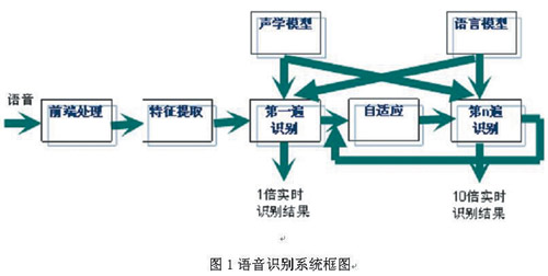 圖1所示為當前大多數(shù)語音識別系統(tǒng)采用的框架和流程。原始語音經(jīng)前端處理后,從中提取出若干維的特征向量用于識別。識別時,聲學模型和語言模型共同作用,得到使某一概率最大的字串作為識別結果。